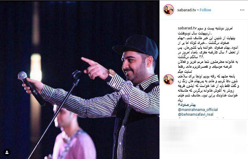 به گزارش سرويس فضاي مجازي خبرگزاري صدا و سيما ؛ بهنام صفوی، خواننده پاپ کشورمان، روز گذشته در ۳۶ سالگی در یکی از بیمارستان‌های اصفهان درگذشت. همزمان با انتشار این خبر جمعی از هنرمندان و چهر‌ه‌های معروف هنری با انتشار عکس‌های آن مرحوم در صفحات شخصی خود در اینستاگرام یاد او را گرامی داشتند و این ضایعه را به خانواده وی تسلیت گفتند.